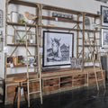 The Brodie V is a stunning, vertical shelving unit that features four mango wood shelves that are removable. A wooden storage cabinet is seen at the bottom which comprises of two drawers. The shelves and other elements of this piece are bound together and stabilized by a solid iron frame and base with a rear side cross bracing that is finished in a rustic nickel tone. With stunning metallic accents that complement the soft wooden tones, the Brodie V is a great choice for spaces based on the Industrial, Farmhouse, Lakeside or Woodlands design styles.
