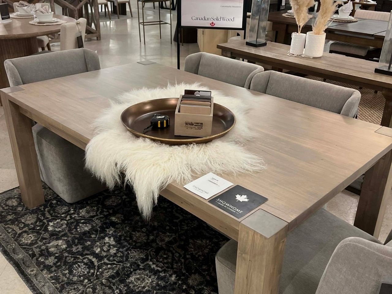 Handcrafted from select hardwoods, this dining table in Calgary offers durable construction and visible grain character from maple and oak options. Multiple top sizes accommodate 4–10 seating layouts and optional 18-inch leaves convert the table for larger gatherings. Mortise-and-tenon joinery and reinforced apron deliver stable support and long-term dimensional integrity. The table is suitable for formal and casual dining rooms and finishes to match traditional interiors. Care requires regular dusting and occasional wood-safe cleaner to preserve the surface.