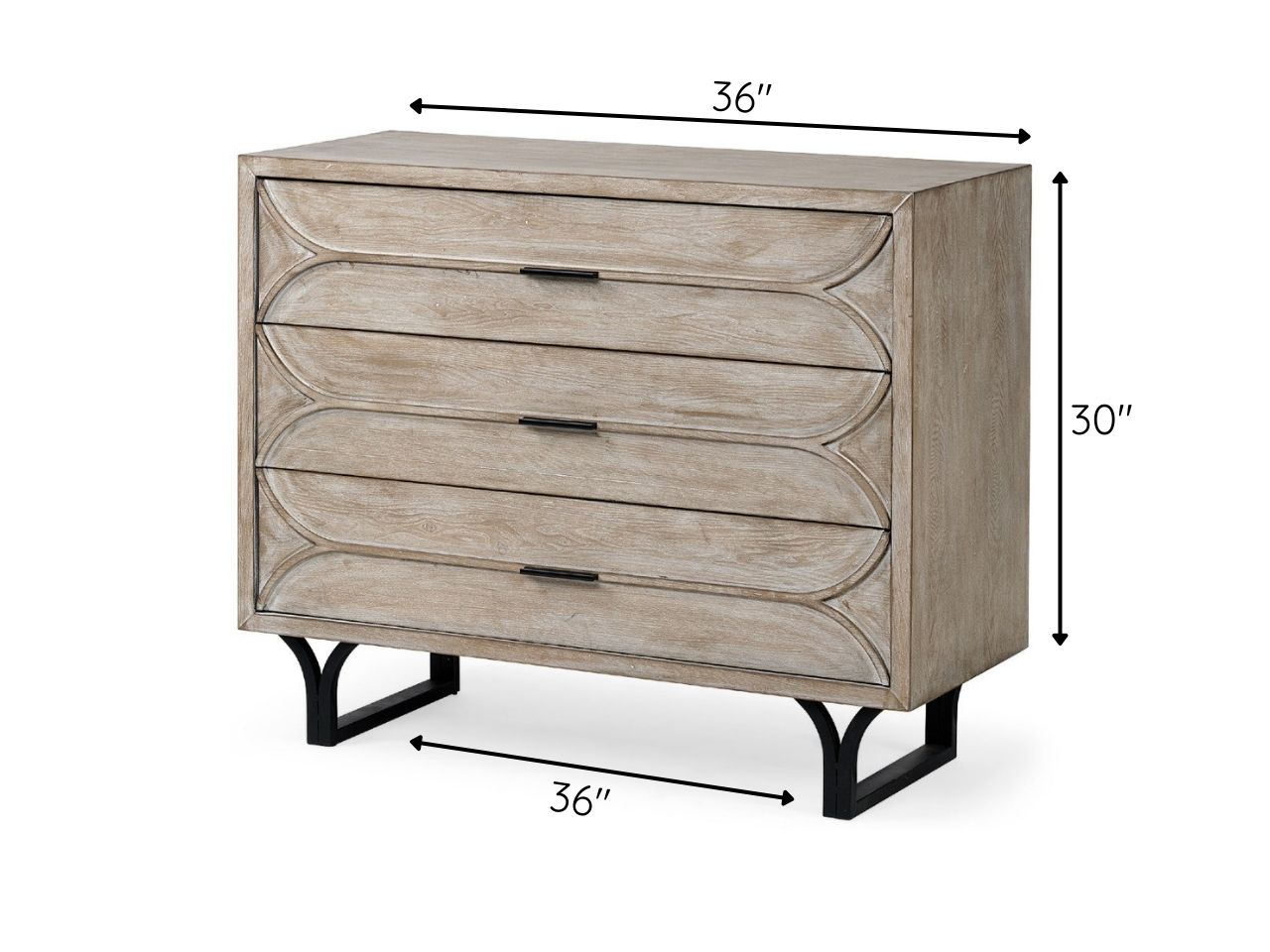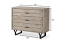 Giselle is a sophisticated accent cabinet in Calgary that is expertly made from engineered wood and finished in a light brown color with bleached overtones. It has three sizable pull-out drawers with elliptical accents that provide plenty of storage space for a variety of products. It is supported by two sturdy metal legs that are matte-finished in black. These legs not only improve the piece's aesthetics but also ensure unmatched stability and balance.