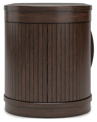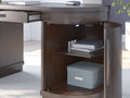 This home office desk is perfectly modern in every way. Finished on both sides in a rich wood tone, it can be floated in a room or used as a divider. Two half round door cabinets, each with an adjustable shelf, deliver a well-organized space for work-from-home professionals. It's a striking study in upscale contemporary form and function.