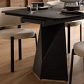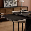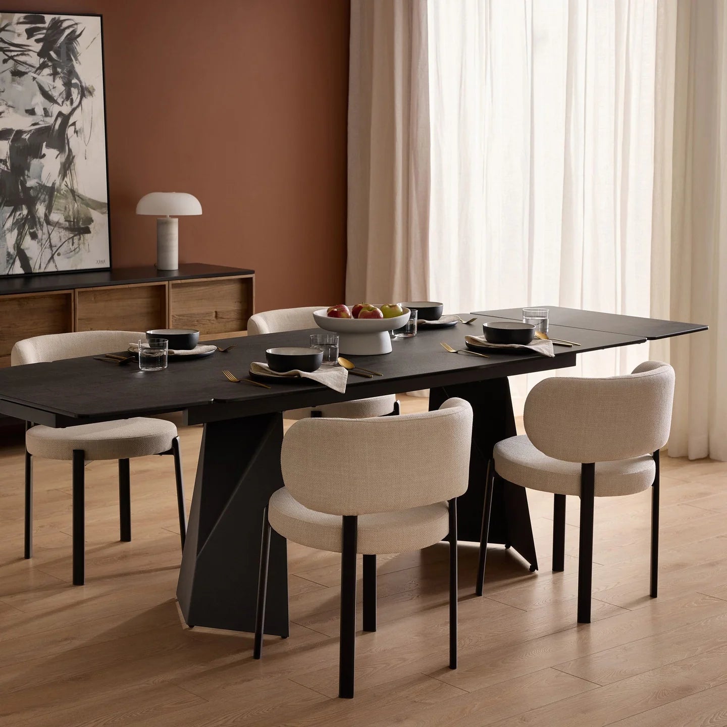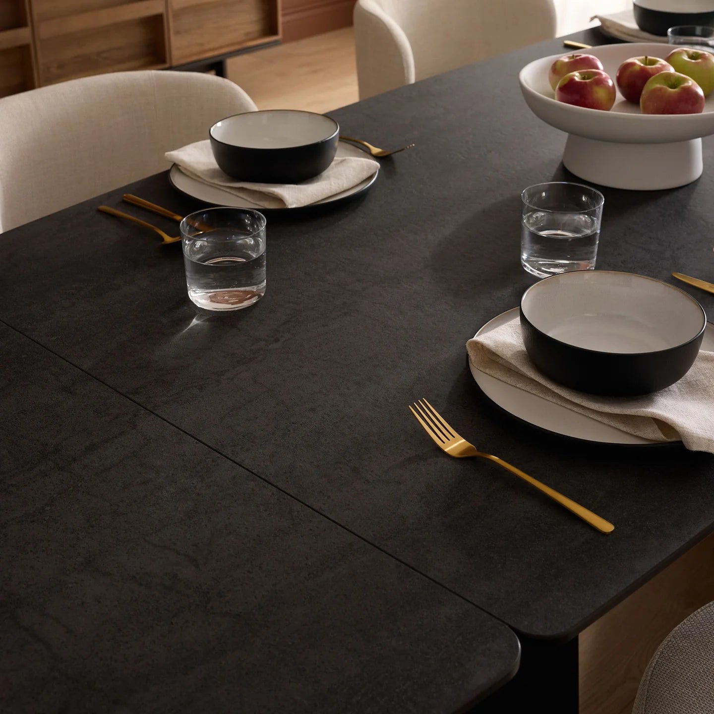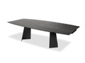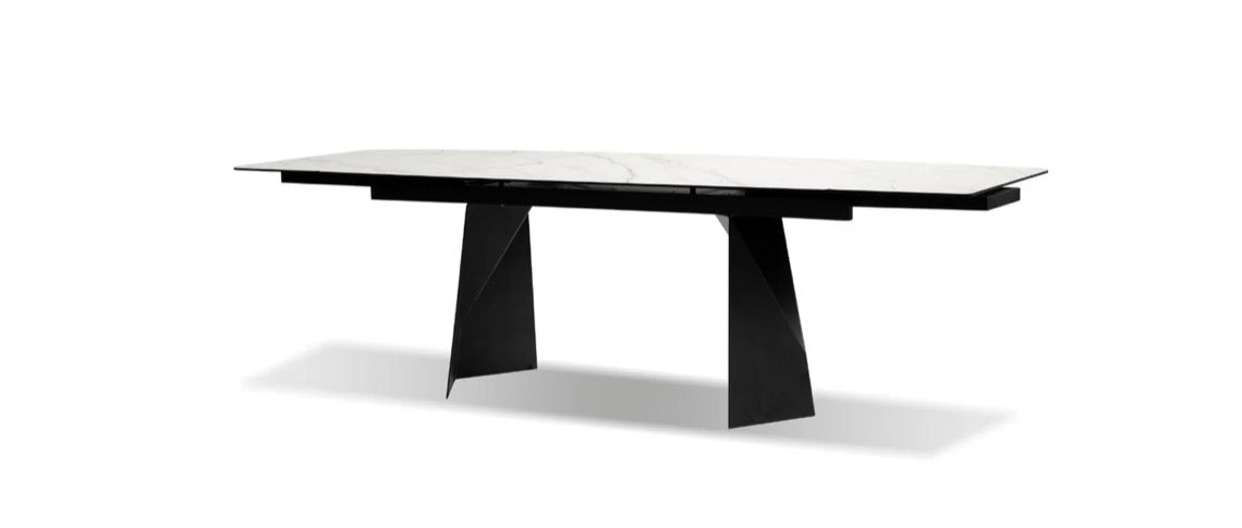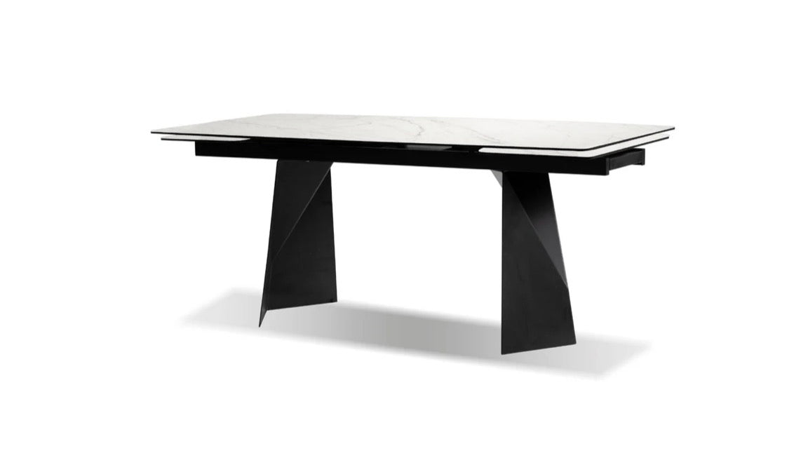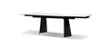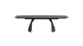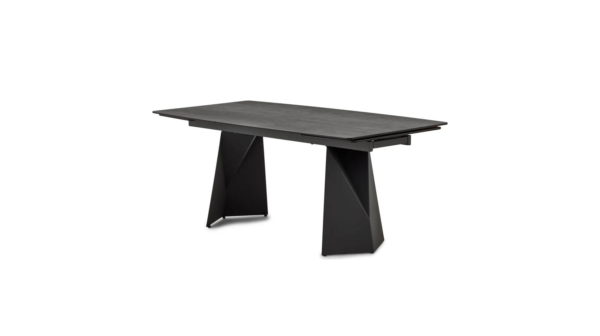 The PRISM dining table has two manual extending leafs that are self storing under the table. It is made with a charcoal powder coated steel base and the top is made from ceramic and glass that is laminated together. The ceramic has a matte textured finish and looks like real slate stone. The ceramic is scratch proof and stain proof and is easily maintained with soap and water. The top also features a gentle curved shape.