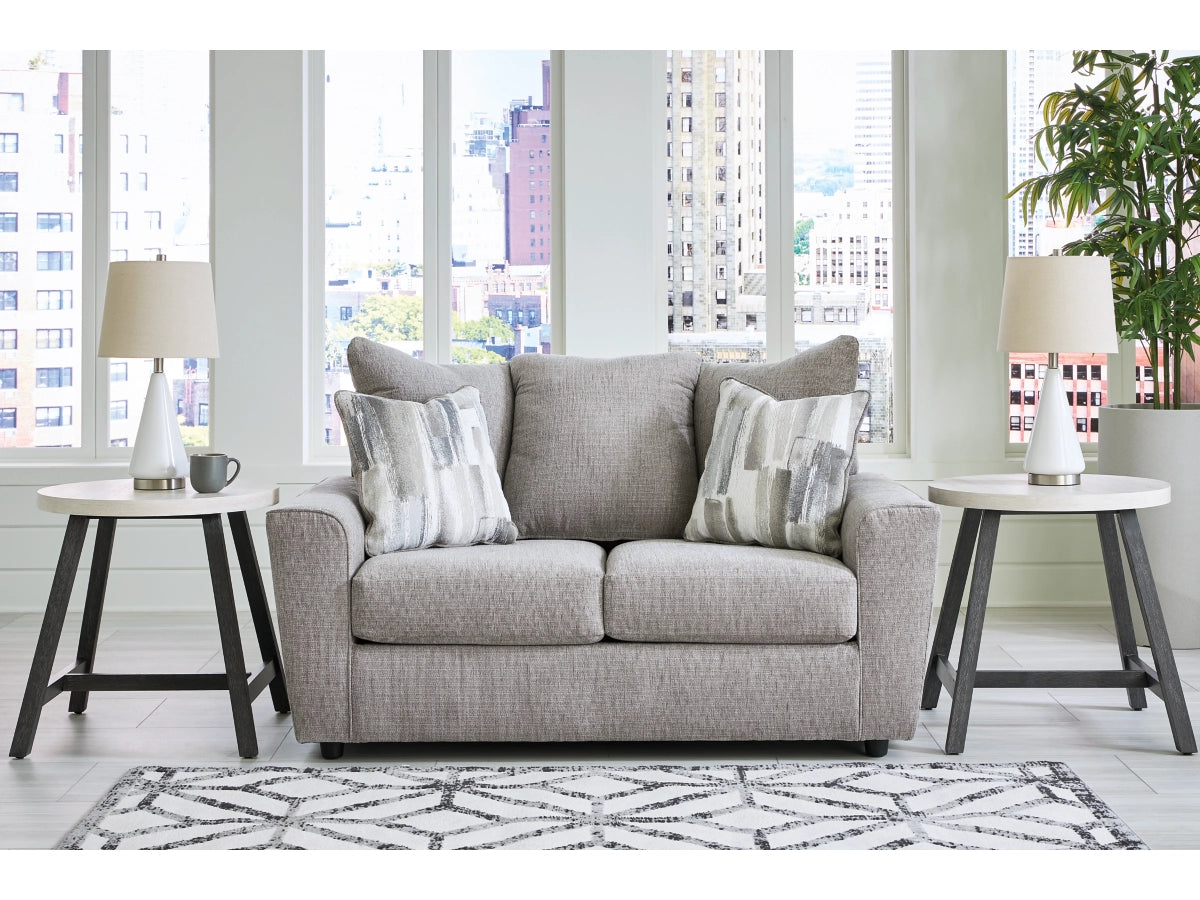 Plush chenille upholstery provides a soft, durable surface with a refined neutral appearance. Generous classic foam cushions deliver balanced support and maintain shape for everyday seating. Flared arms and a clean contemporary silhouette offer visual interest while remaining compact for smaller living rooms. Two brushstroke accent pillows add layered style and immediate comfort. A corner-blocked hardwood frame and platform foundation provide structural stability for long-term use.