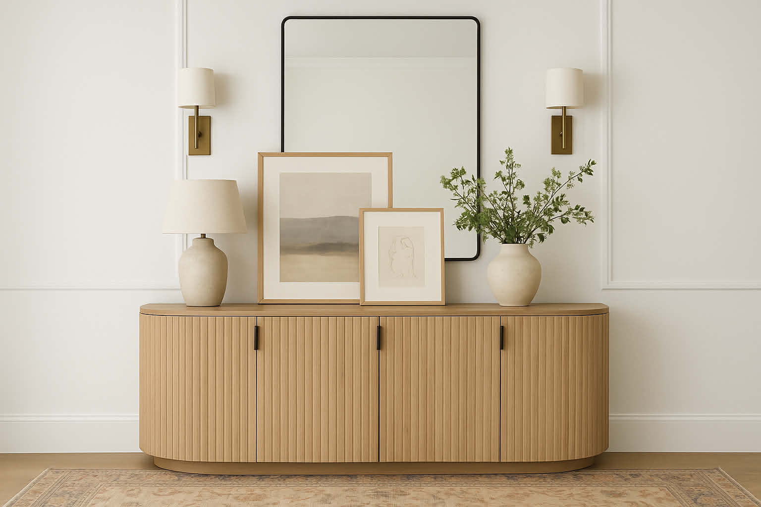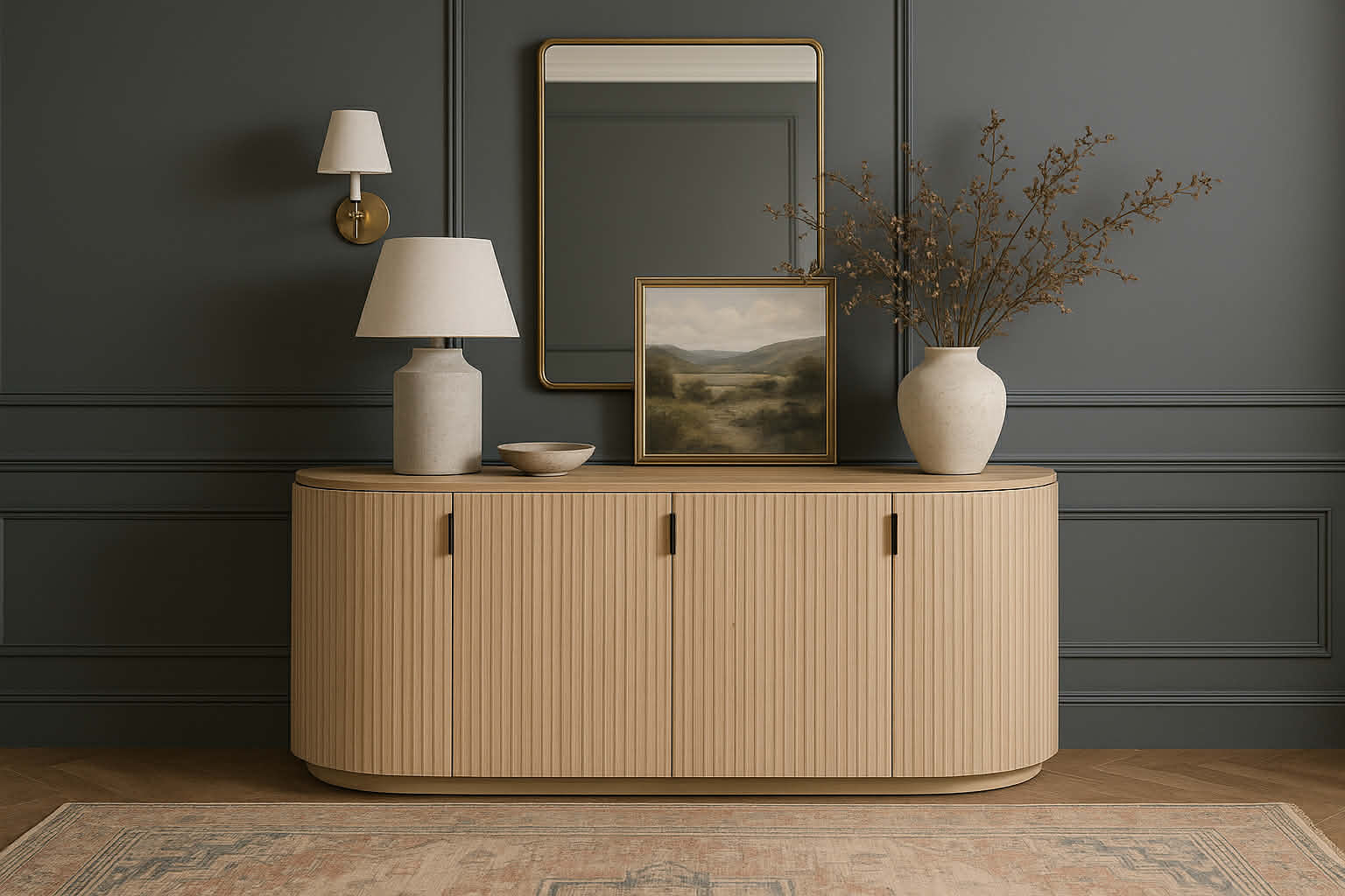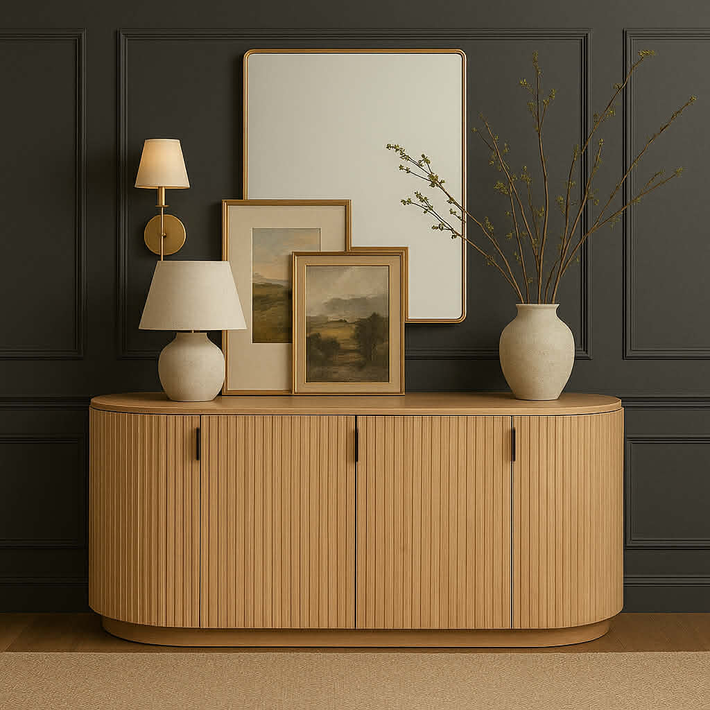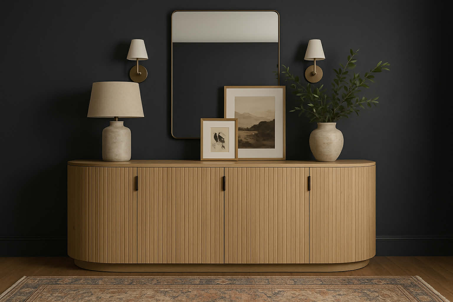The gorgeous Terra light brown sideboard in Calgary is a bold yet elegant addition to the modern house. Its curving, solid wood design with fluted features will sit elegantly in a space and make a statement while concealing daily necessities.